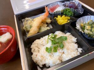 この日は鯛めしに天ぷら、紅白ゼリーにフルーツにと豪華なご飯!!