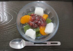 抹茶あんみつ(今年は某メーカー様のレシピを参考にしてお餅風ゼリーを作りました)盛り付けも