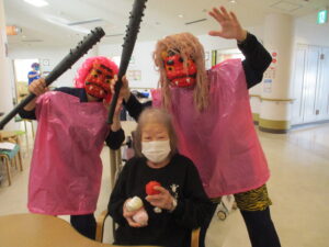 鬼に向かって紅白の豆(特製豆)まきを行いました😁